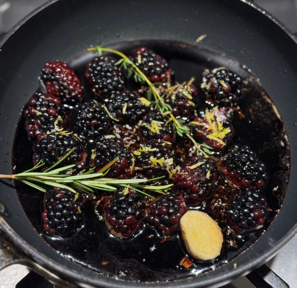 In a medium saucepan, add the Blackberry Ginger Dark Balsamic, fresh blackberries, ginger, brown sugar, maple syrup, rosemary, thyme, lemon zest and salt.