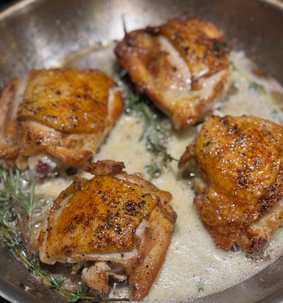 Add the remaining 2 tbsp of Rosemary Olive Oil to a large cast iron or oven safe skillet. Sear the thighs skin side down until nicely browned.
