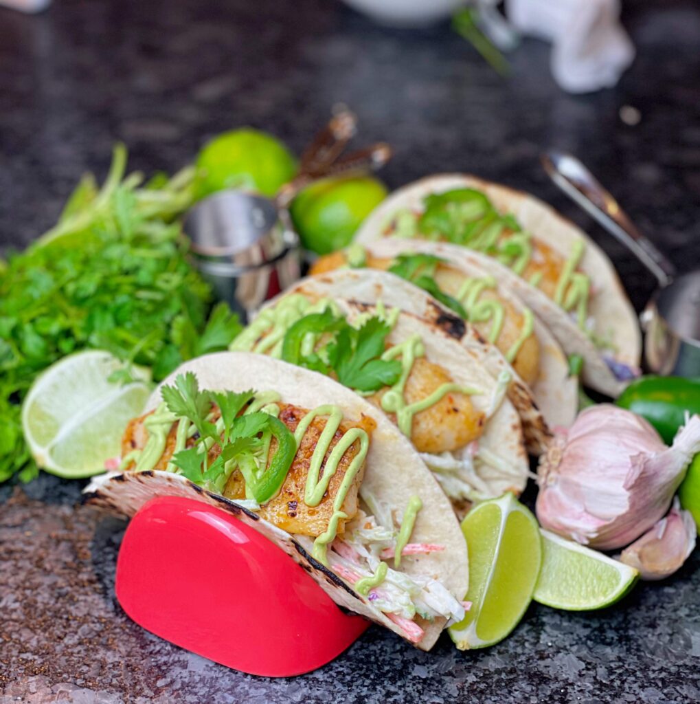 Heat your tortillas over an open flame or on a grill pan for a minute or so until they develop a nice char. Place a scoop of slaw in the bottom of the taco and top with a piece of fish. Finish with a drizzle of the avocado crema. (For a nice presentation, you can create a makeshift piping bag by scooping the avocado crema into a small plastic bag. Make a small cut at the tip of the bag and gently squeeze the bag at the opposite end to create nice, neat lines of crema. If presentation doesn't matter, you can easily just add a dollop of crema on top of the taco!)