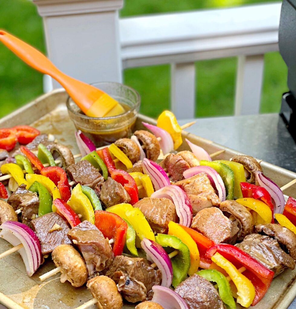 Grill your kabobs for 4 minutes on one side. Halfway through cooking, brush the steak with the reserved marinade to keep it extra juicy. Flip the kabobs over, brush the other side. Continue cooking for another 4 minutes for medium to medium-rare.