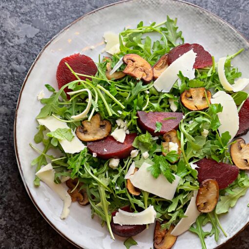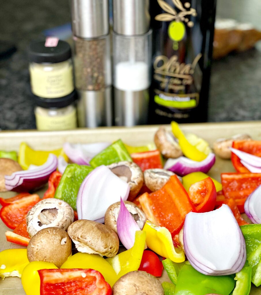 Cut the peppers and onions into the same size pieces as the steak. You want everything to be as close to the same size as possible. This will ensure even cooking! (You do not have to cut the mushrooms) Toss the veggies with the Oliva! Organic Tunisian Chetoui EVOO, garlic powder, onion powder, salt & pepper.