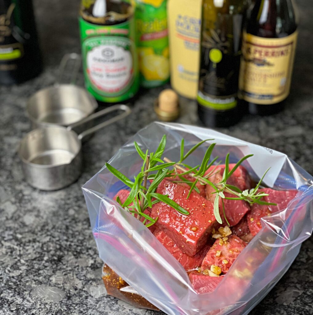 Cut the steak into equal sized cubes that are roughly 1¼ - 1½ inches on all sides so every piece cooks evenly. Place cubed steak into a ziplock bag and marinate for a minimum of 3 hours, but a maximum of 6 hours. Remove from the fridge 30 minutes before cooking to bring closer to room temperature.