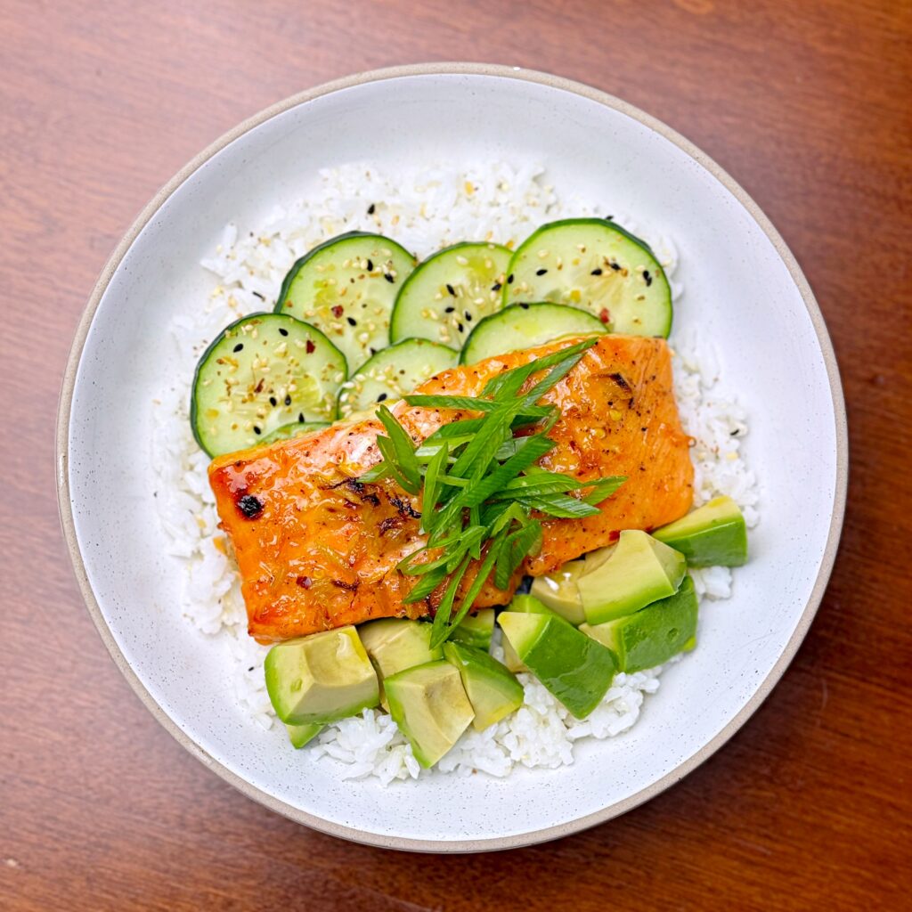 Serve the salmon over rice with freshly sliced cucumbers, avocado, and chopped green onions. Enjoy!