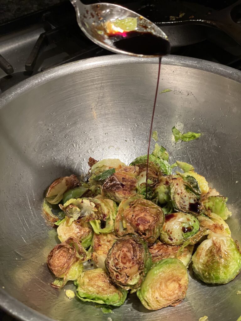 Remove the pan from the oven and gently toss the brussels sprouts with 2 tbsp of Blackberry Ginger Dark Balsamic. Serve & enjoy!
