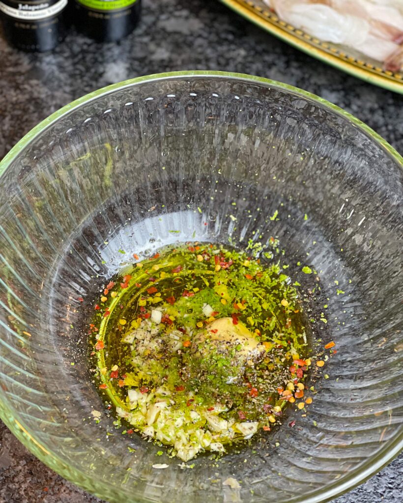 In a medium bowl, combine the Garlic Olive Oil, Jalapeño White Balsamic, minced garlic, dijon mustard, zest & juice of ½ lime, dried basil, red pepper flakes, salt & pepper. Whisk until combined. Add the shrimp and toss until fully coated. Allow the shrimp to marinate for 15 minutes. If it sits longer than that, the acid in the balsamic & citrus zest will start to cook the shrimp!
