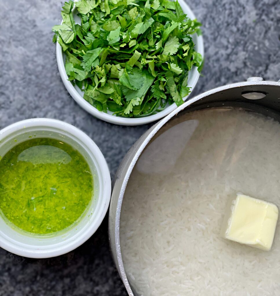 Bring the water, rice, butter and salt to a rolling boil. Cover and reduce to a simmer for 17 minutes. Remove from the heat and fluff with a fork. Fold in the cilantro, lime juice and lime zest.