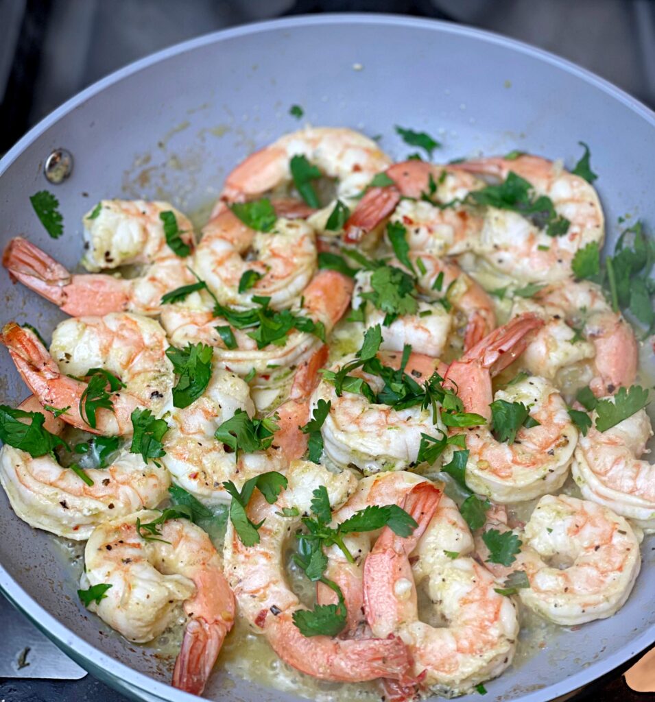 Heat a skillet over medium heat. Add 1 tbsp of EVOO and saute the shrimp for 3-4 minutes per side or until just opaque pink/white. Sprinkle the cilantro over the shrimp and toss at the last minute. Remove from the heat and set aside.
