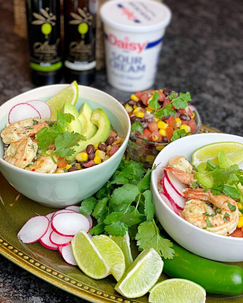 Spoon the rice into the bottom of the bowl. Arrange the shrimp, salsa and garnishes evenly on top of the rice and enjoy!