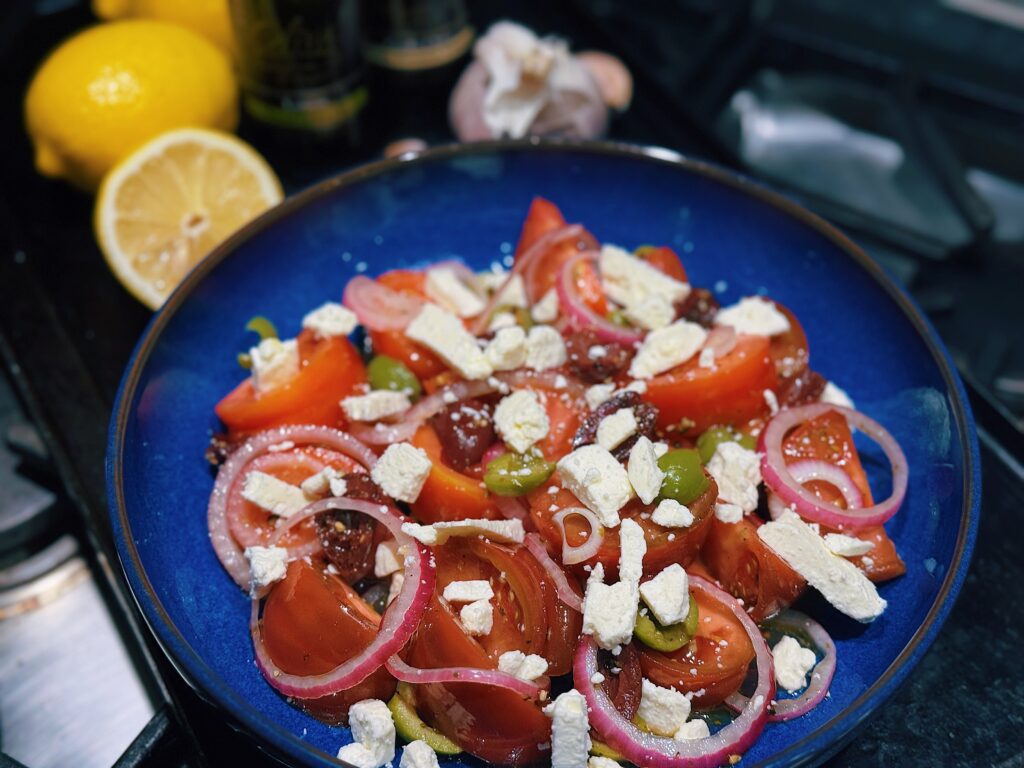 Transfer tomato salad and all juices to a serving platter or bowl and top with the crumbled feta.